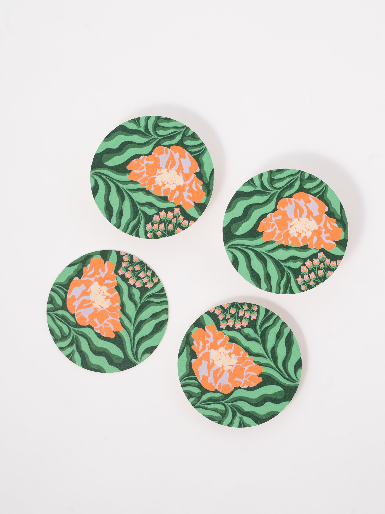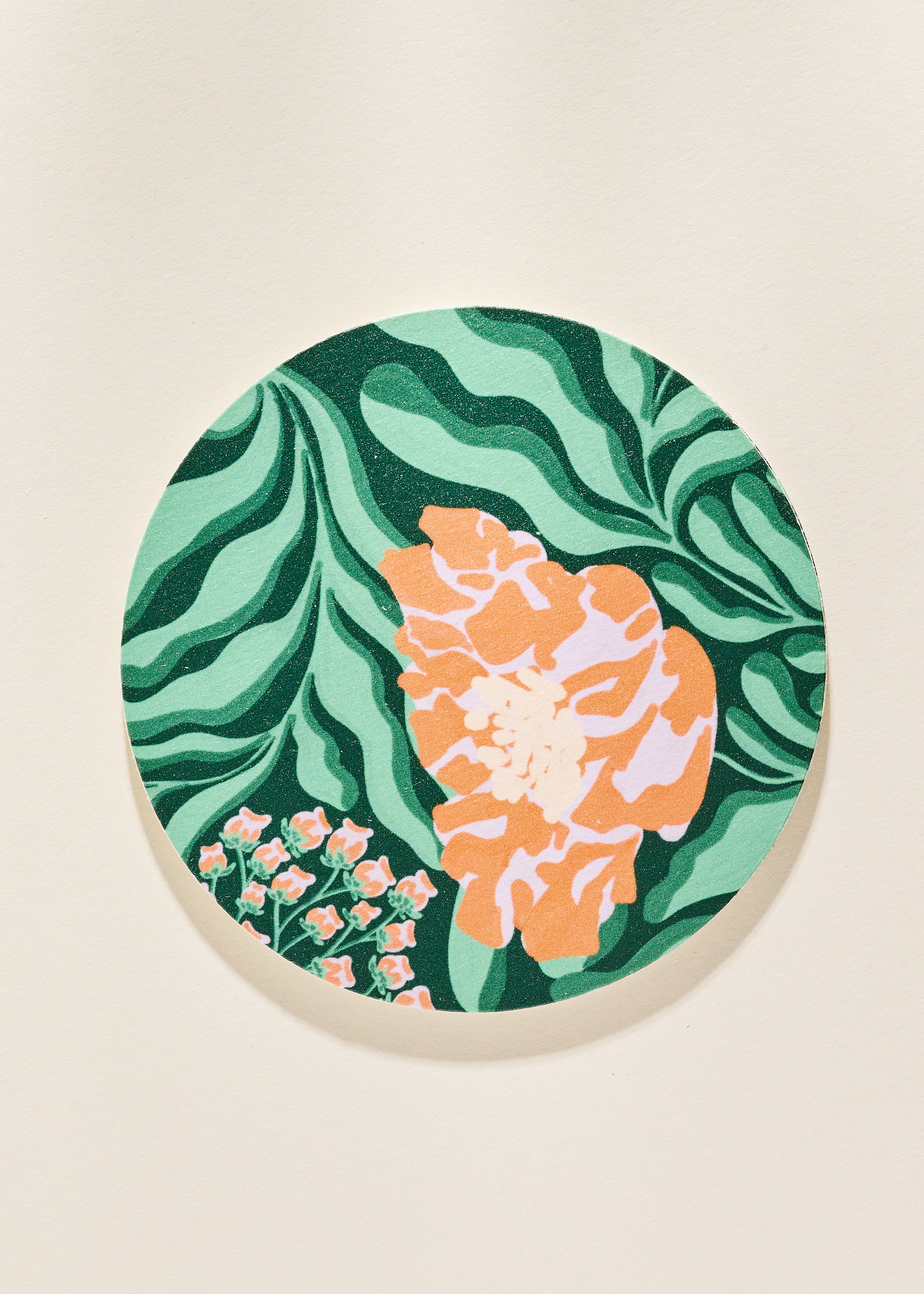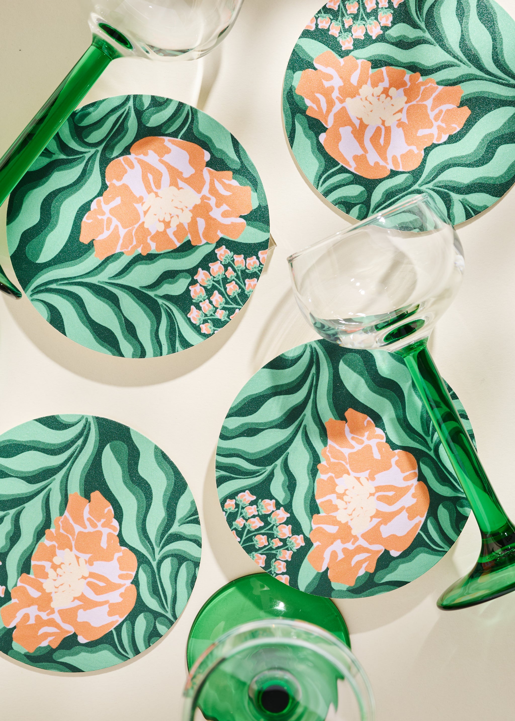 Our coasters are comprised of wood pulp, made exclusively with shavings from sustainable forestry. They are printed with UV ink, and packaged with a foil-pressed belly band made of recycled cotton paper.