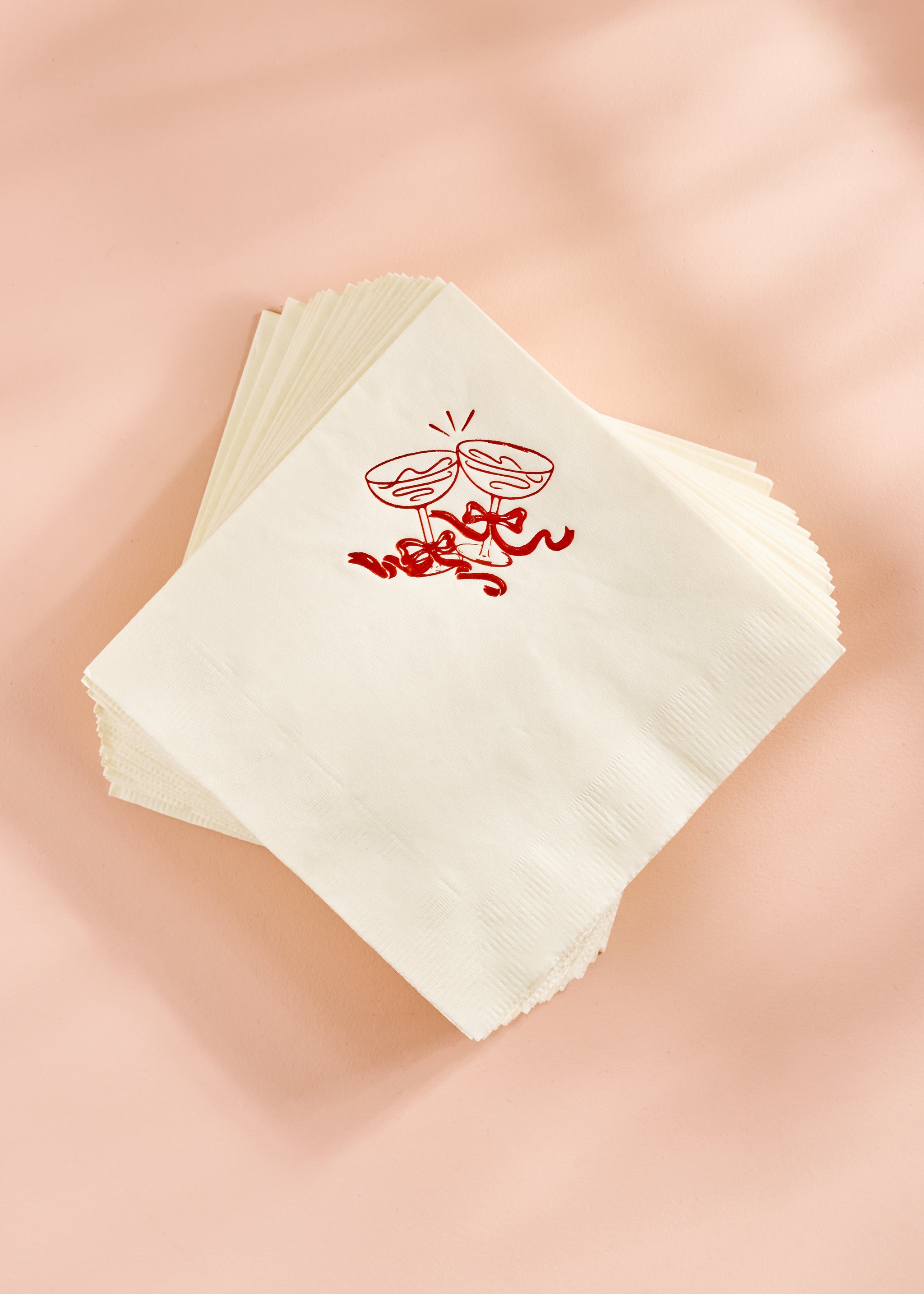 Cheers to good times and good company! Featuring a playful sketch of clinking glasses and festive streamers in bold red foil, these napkins are ready to party.