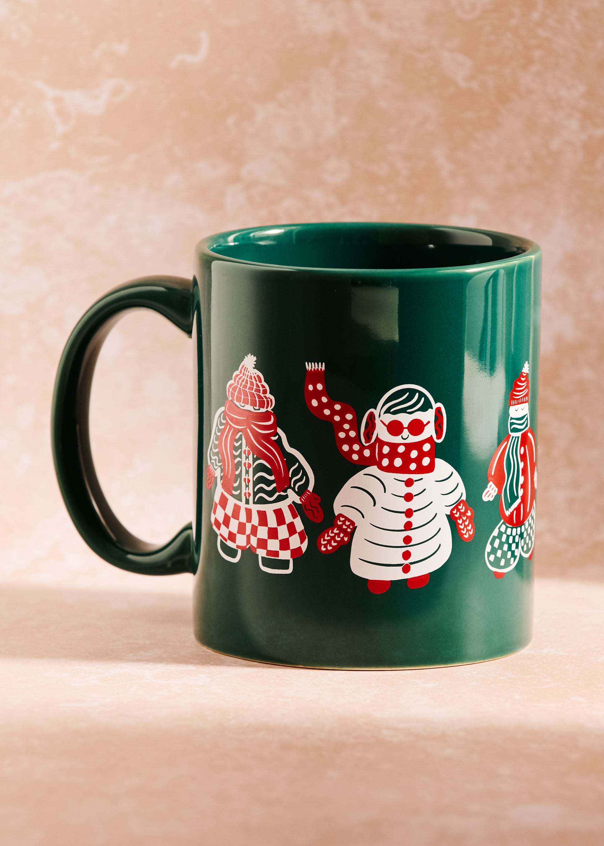 Sip your coffee in style with our screen printed ceramic mug, where a crew of charming characters are all set for their winter adventures