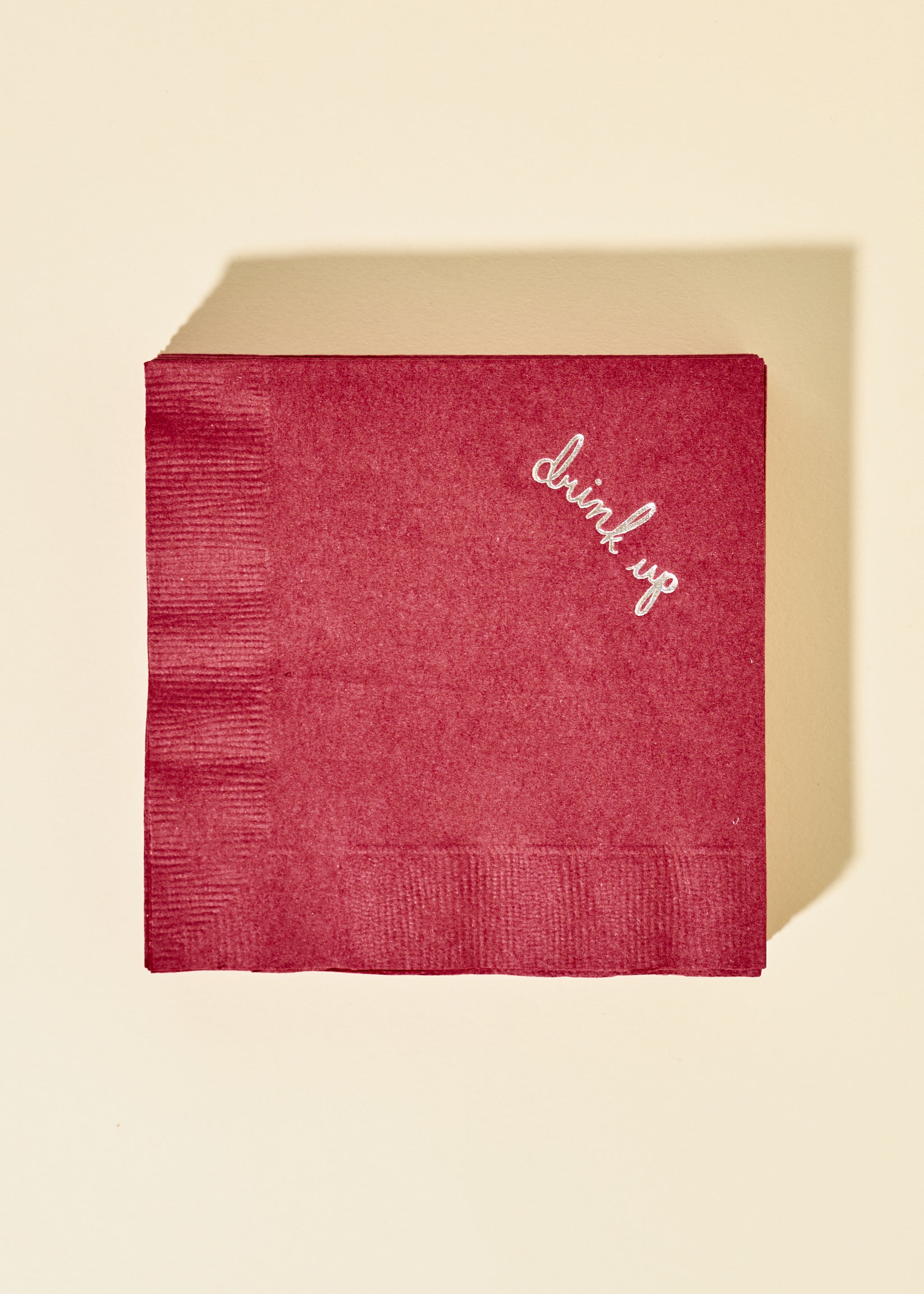 Add a little fun to your next gathering with these burgundy cocktail napkins! Featuring a hand lettered command “Drink Up” in silver, they’re perfect for keeping things stylish and spill-free.