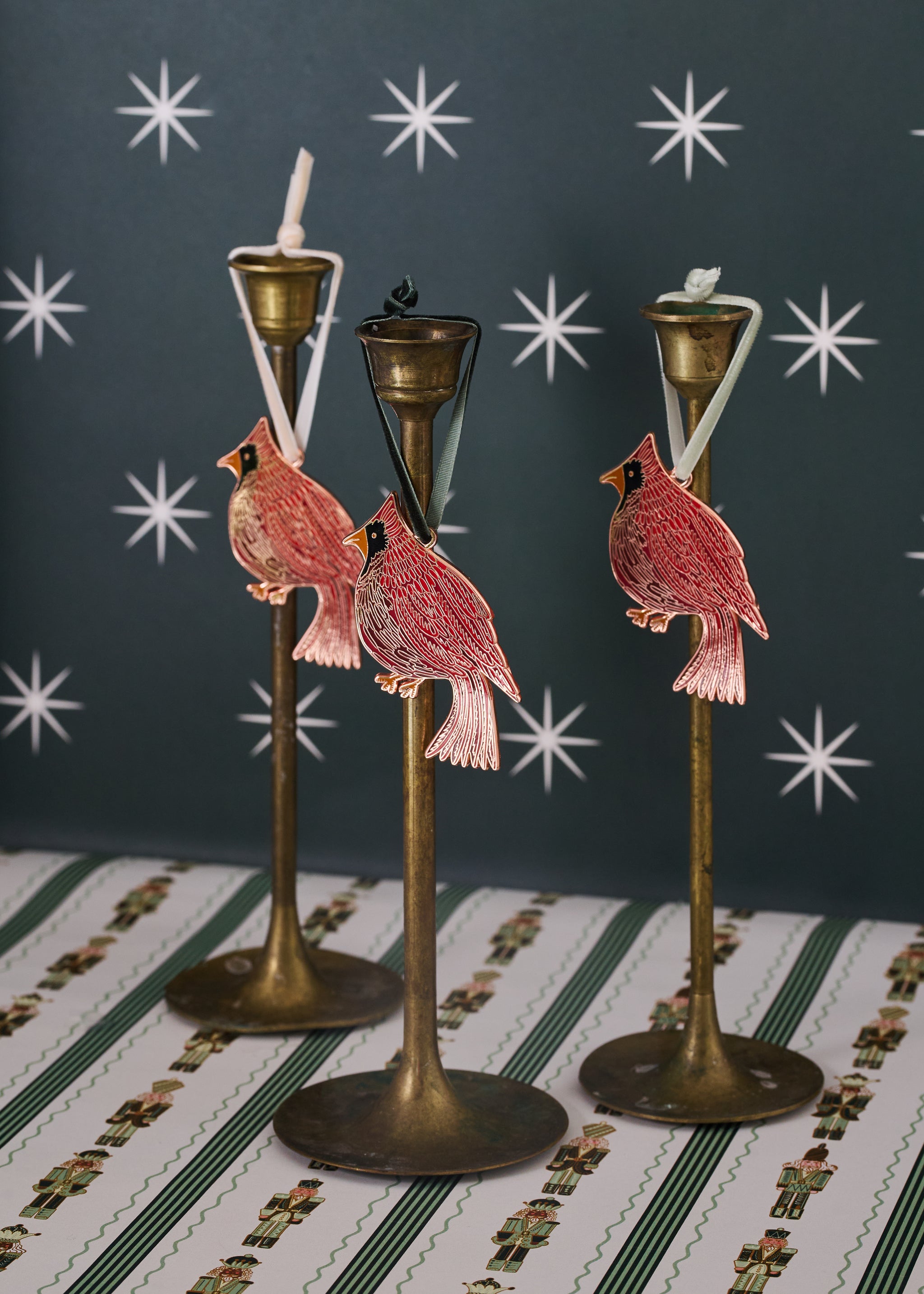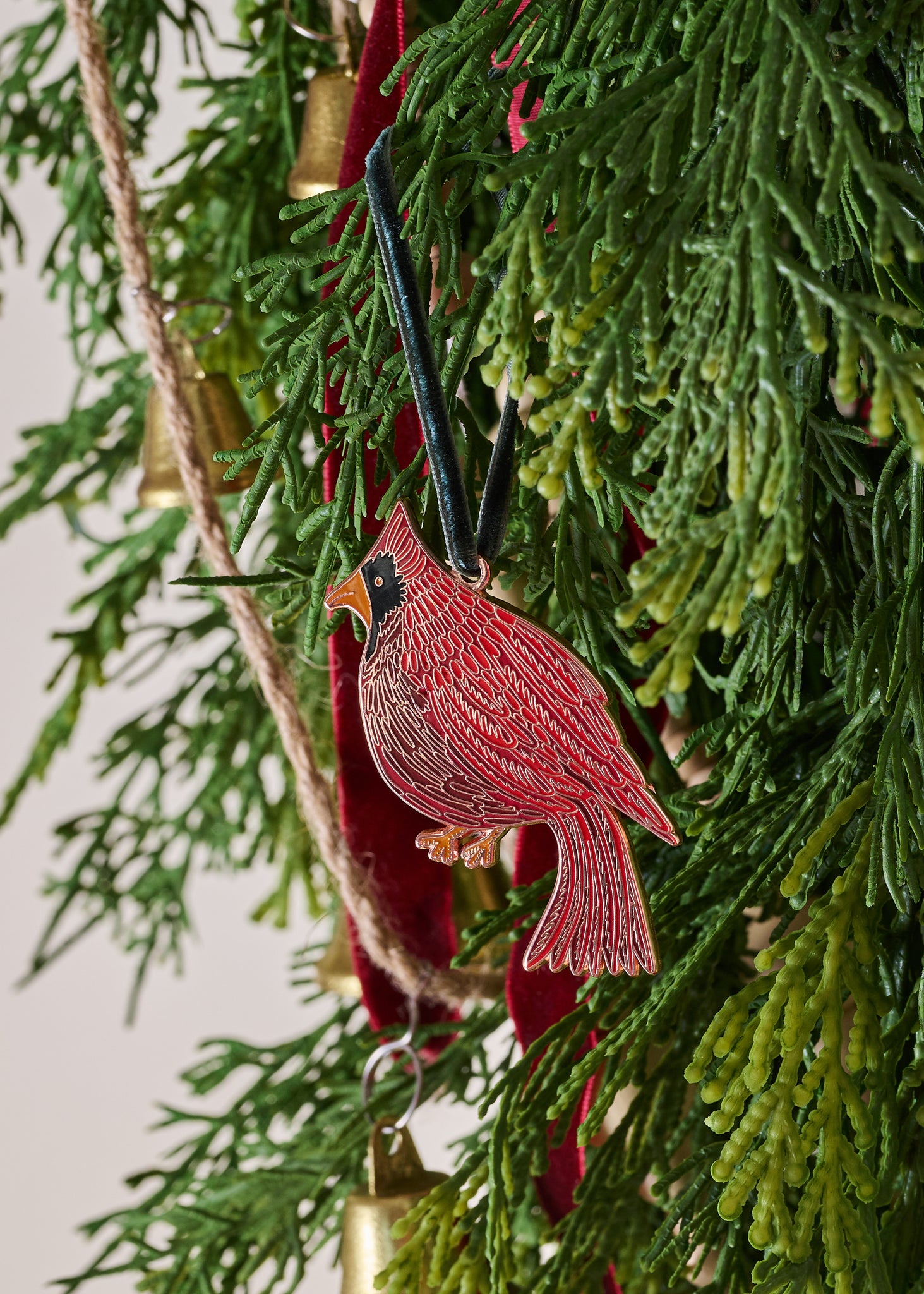 This vibrant cardinal ornament celebrates the quiet beauty of the winter season. Inspired by an original illustration, and measuring 2.5 inches tall by 2 inches wide, this piece captures the beloved cardinal in rich detail.