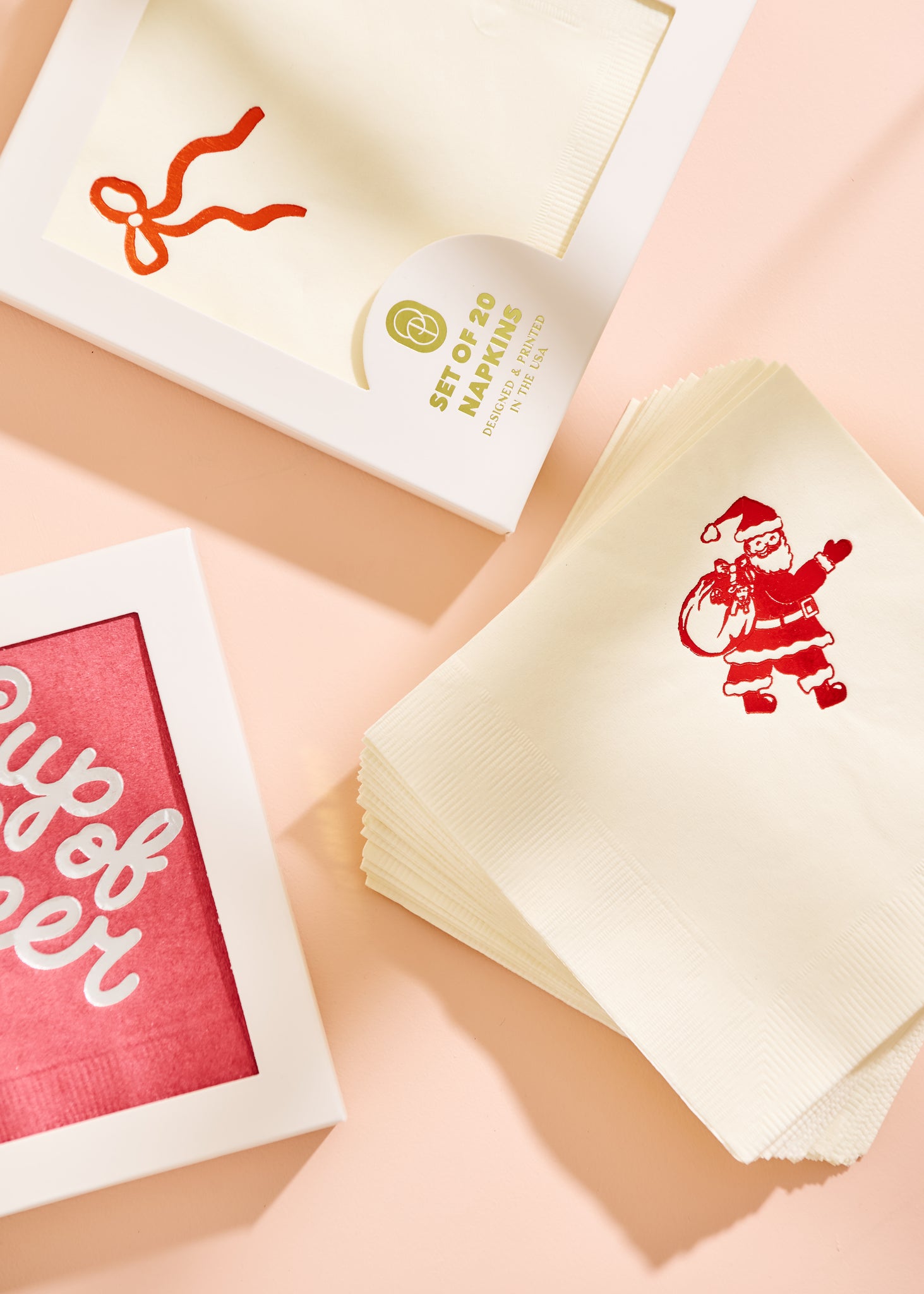 These cocktail napkins make a great hostess gift. Set of 20 3 ply napkins with shiny gold foil printing. Measures roughly 5 x 5 inches, and will arrive packed in a clear box.