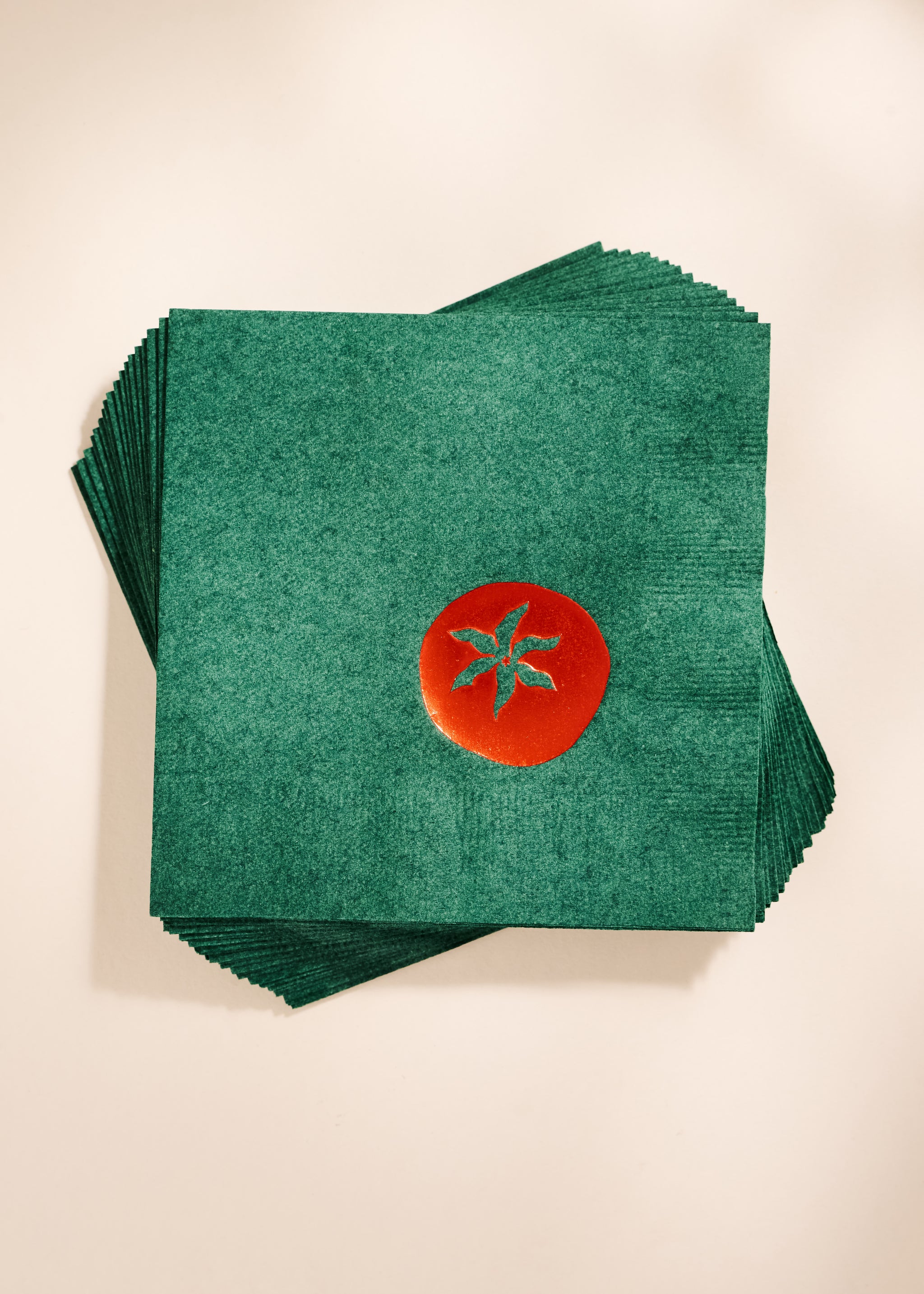 Freshen up happy hour with our juicy tomato napkins! Bold and bright, they’re the perfect complement to your summer snacks and spritzes.