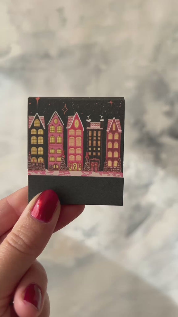 Capture cozy holiday vibes with this illustrated Christmas village matchbook, perfect for setting a festive scene by your favorite candles.