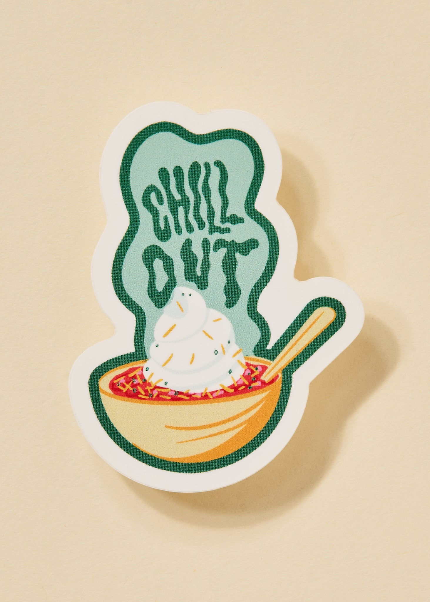 This high-quality sticker features a vivid illustration of a bowl of chili with ‘Chill Out’ written in the steam for a touch of whimsy. Made from waterproof and scratch-resistant material, this sticker is designed for indoor use, and is repositionable – allowing you to place it just about anywhere. At 1.5 x 2.5 inches, it fits perfectly on your laptop, water bottle, or anywhere else you’d like.