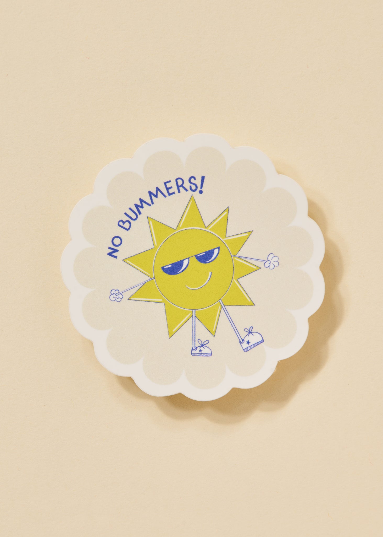 Stay sunny with the No Bummers Sunshine Sticker. This premium sticker is composed of waterproof, scratchproof, and repositionable material, making it long-lasting and durable. Its round shape with scalloped edges measures 3 inches and features an illustration of a smiling sun wearing sunglasses and clouds for hands.