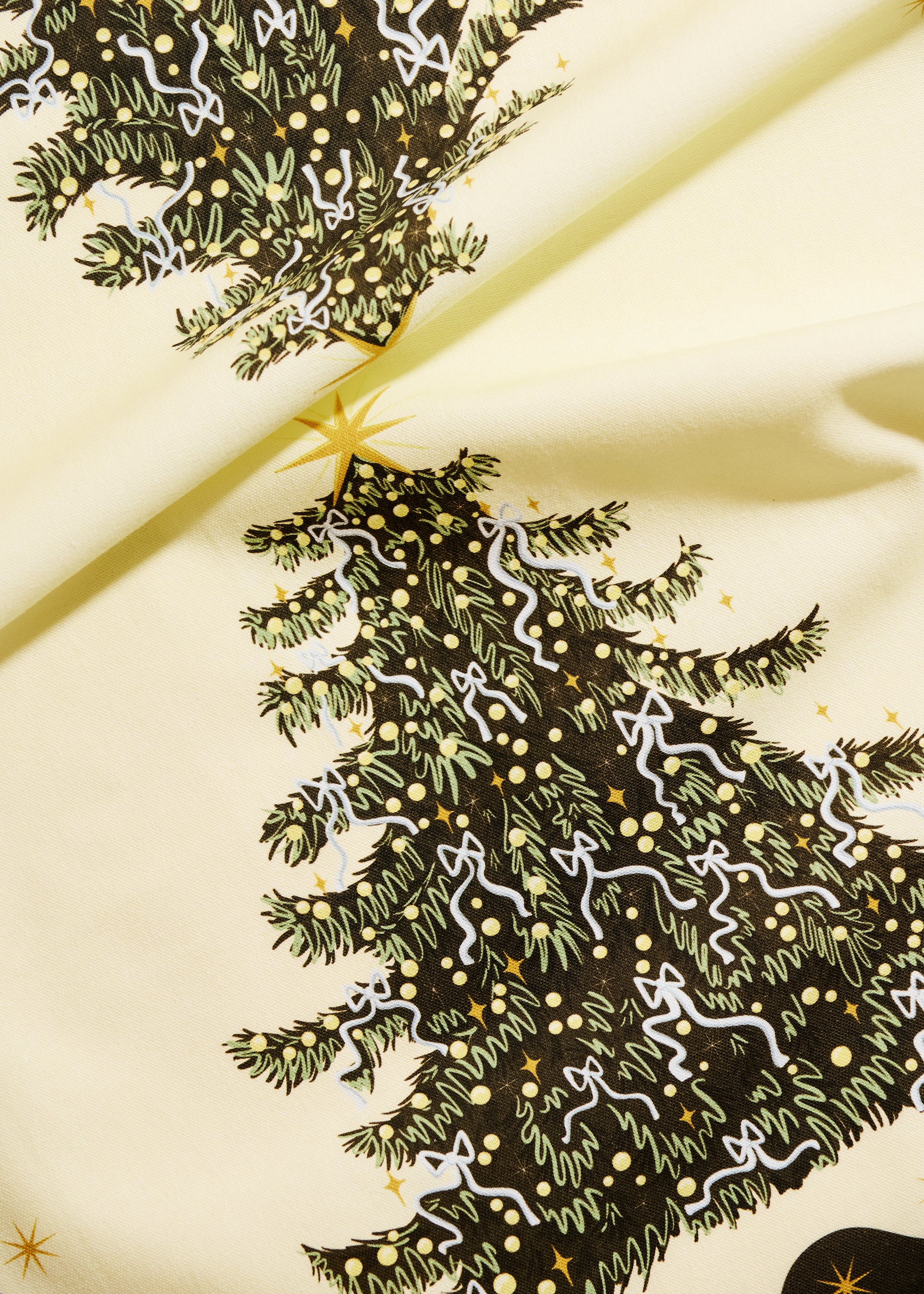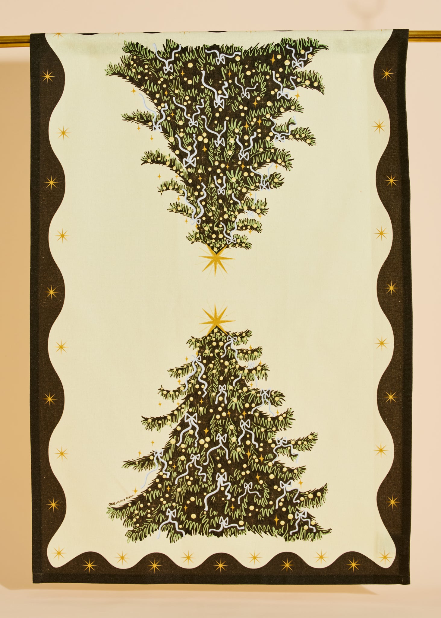 Rich with detail and timeless charm, this evergreen design features hand-illustrated trees adorned with ribbons, stars, and festive touches. Framed in wavy edges and warm gold accents, it brings a sense of nostalgia and quiet joy to any season.