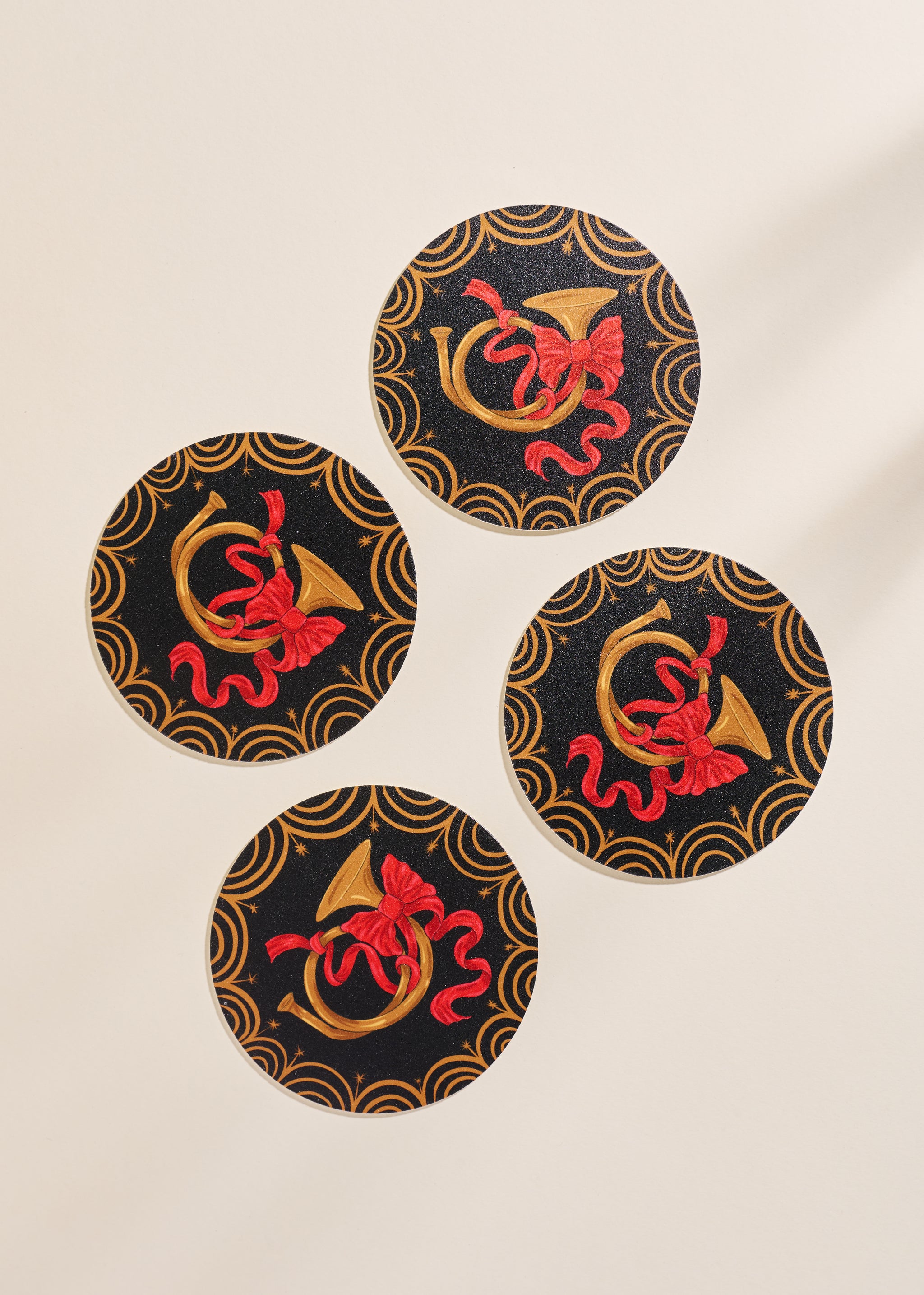 This charmingly illustrated bugle coaster with a festive bow - so on trend! - is ideal for holiday parties.