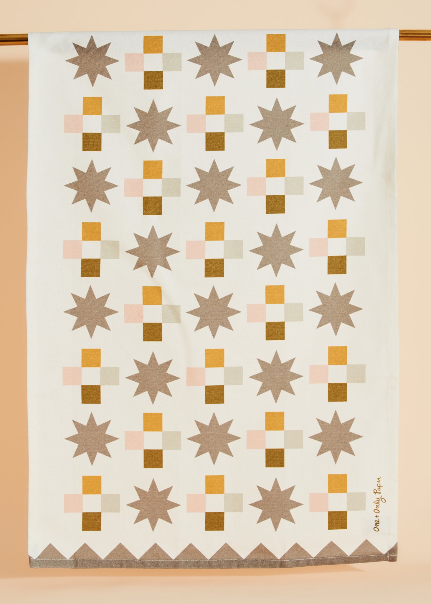 Inspired by classic quilt motifs, this geometric tea towel brings warmth and structure to your kitchen. The earthy palette of mustard, taupe, blush, and ivory feels modern yet timeless, while the clean pattern adds a cozy, lived-in texture to your space.